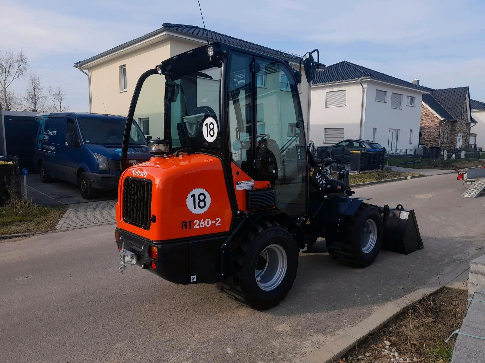 Miete unseren knickgelenkten Radlader von Kubota! Mit dem RT260-2 lassen sich unterschiedliche Transportaufgaben und Planierarbeiten durchführen. Dieser Radlader mit einem Einsatzgewicht von 2.605 kg kombiniert Leistung und kompakte Bauweise.